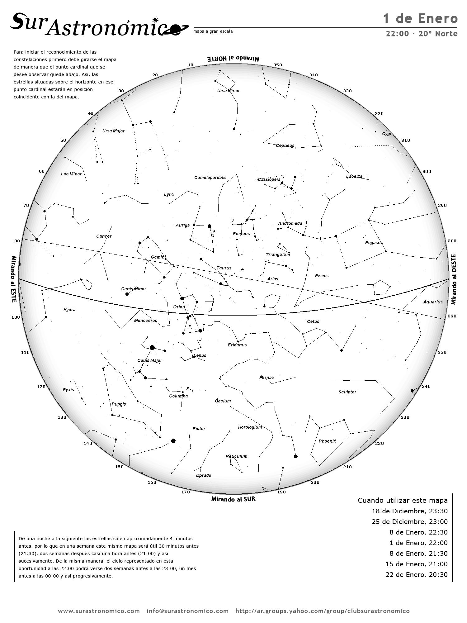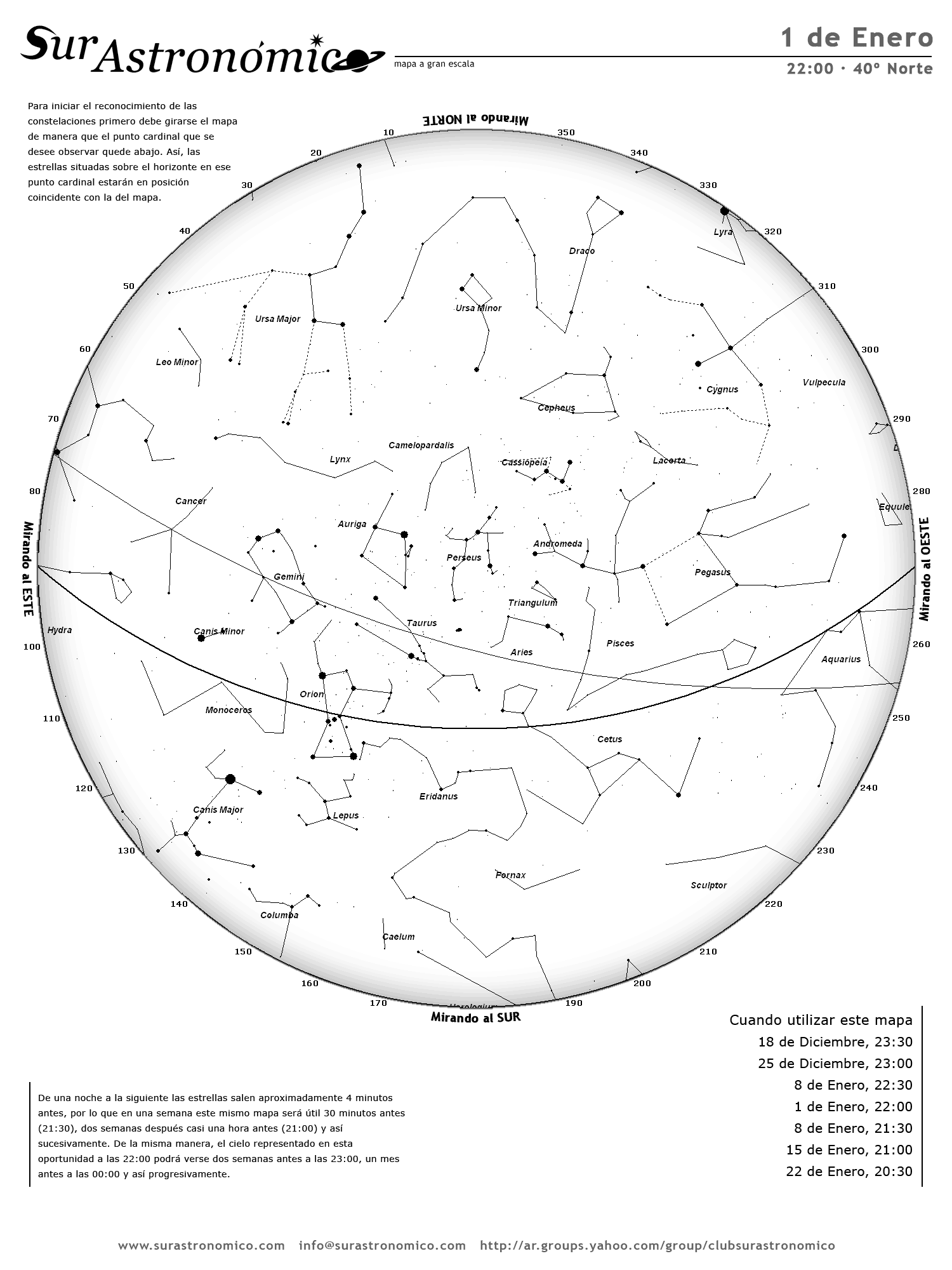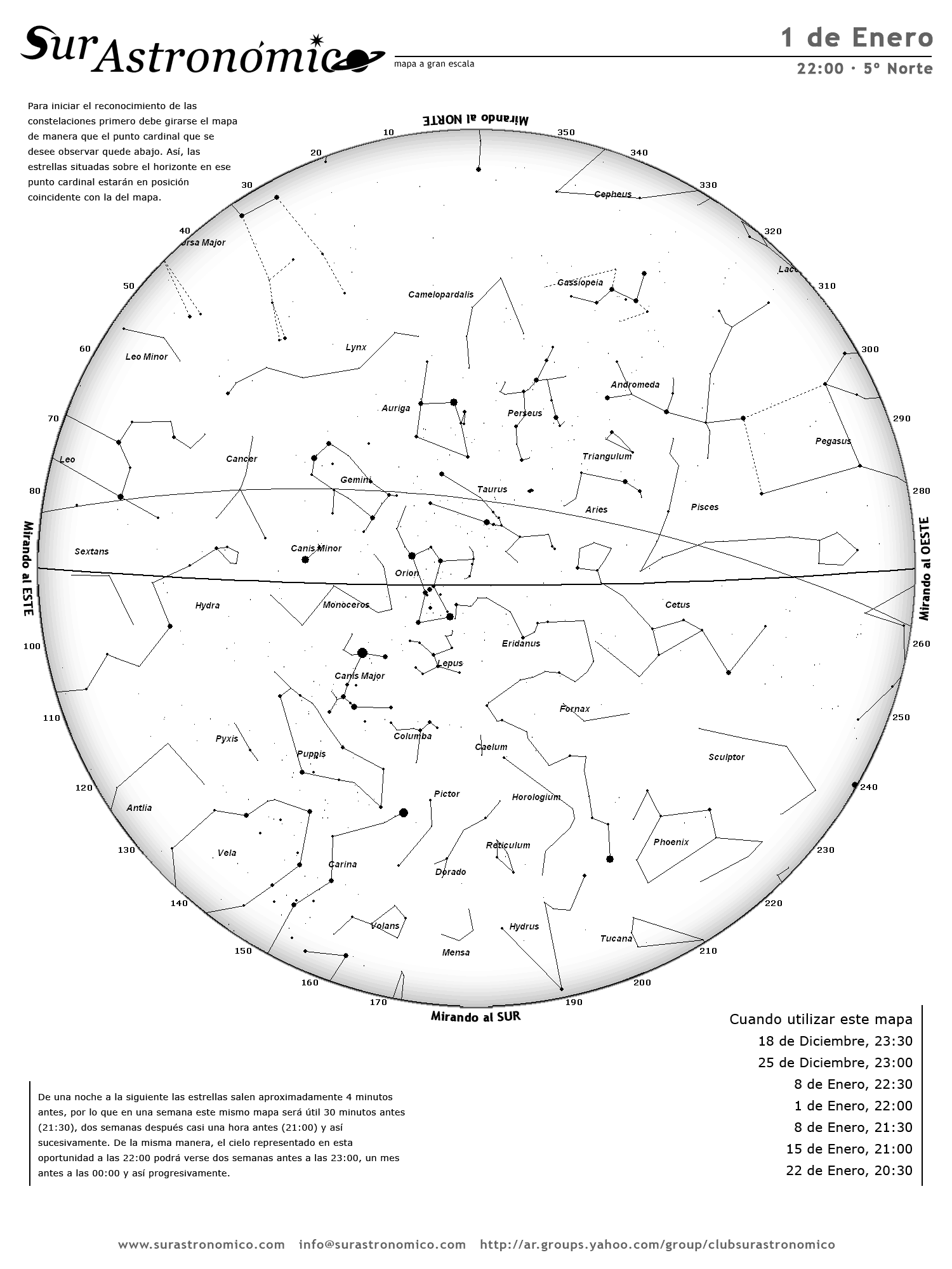• De una noche a la siguiente las estrellas salen aproximadamente 4 minutos antes, por lo que en una semana este mismo mapa será útil 30 minutos antes (21:30), dos semanas después casi una hora antes (21:00) y así sucesivamente. De la misma manera, el cielo representado en esta oportunidad a las 22:00 podrá verse dos semanas antes a las 23:00, un mes antes a las 00:00 y así progresivamente.