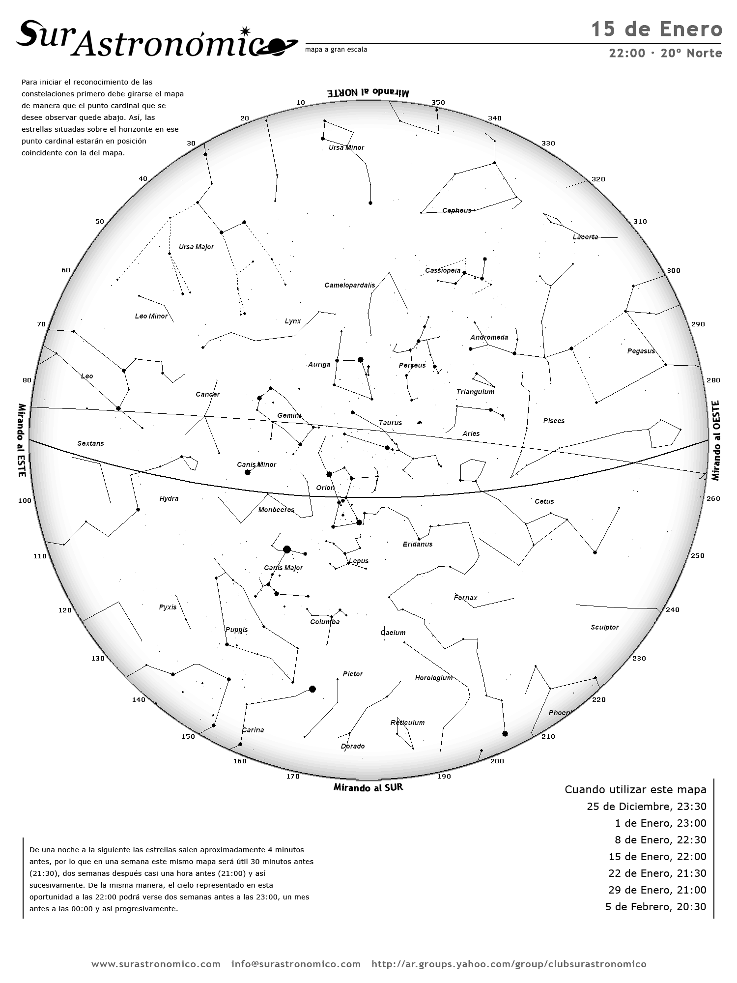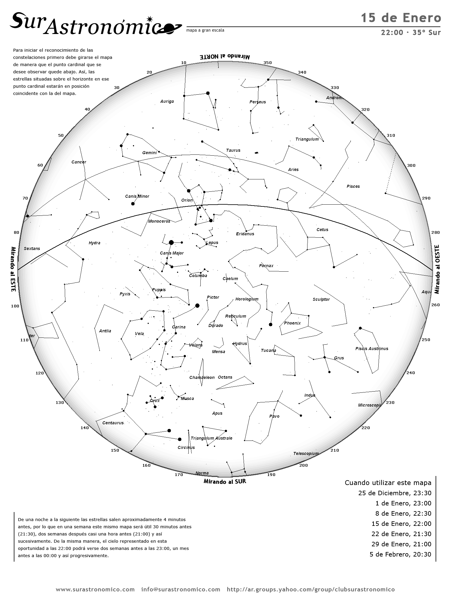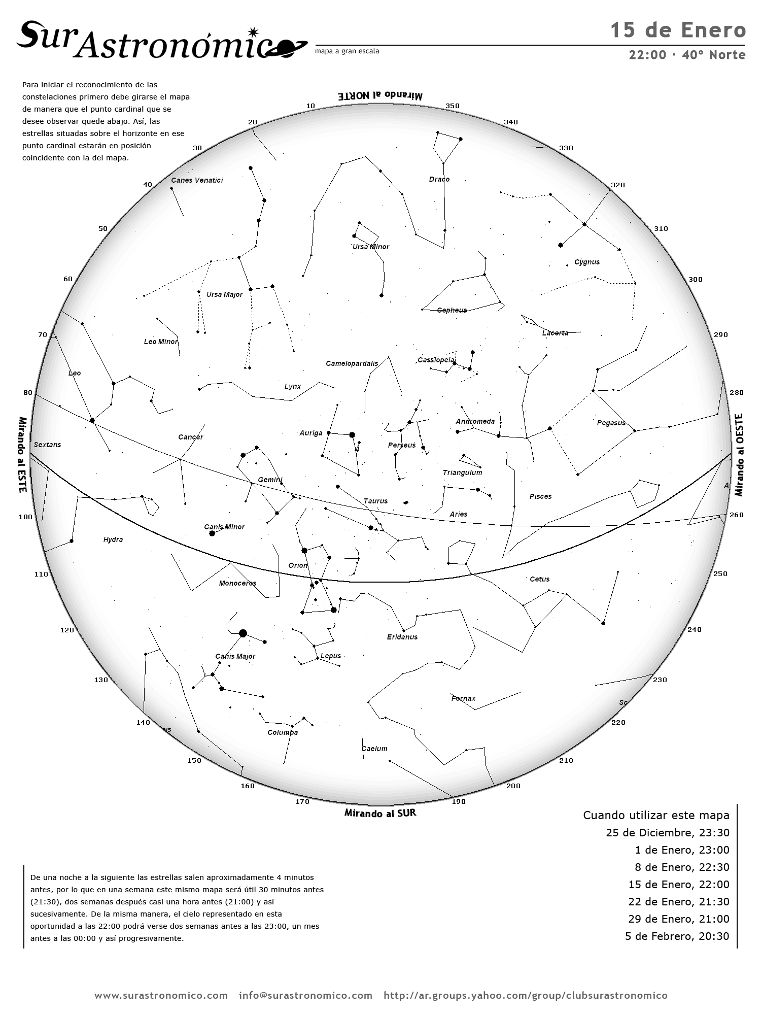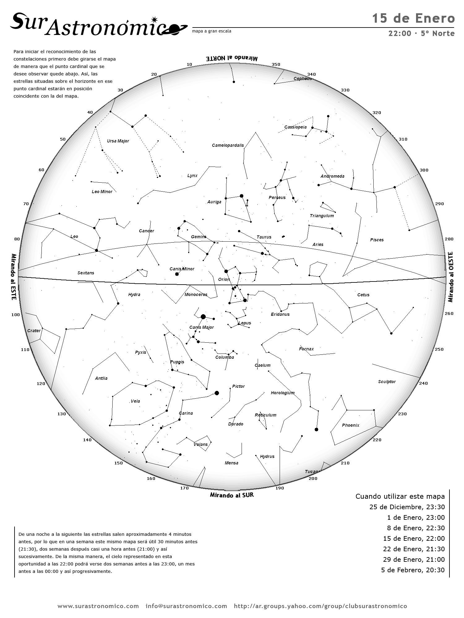 • De una noche a la siguiente las estrellas salen aproximadamente 4 minutos antes, por lo que en una semana este mismo mapa será útil 30 minutos antes (21:30), dos semanas después casi una hora antes (21:00) y así sucesivamente. De la misma manera, el cielo representado en esta oportunidad a las 22:00 podrá verse dos semanas antes a las 23:00, un mes antes a las 00:00 y así progresivamente.