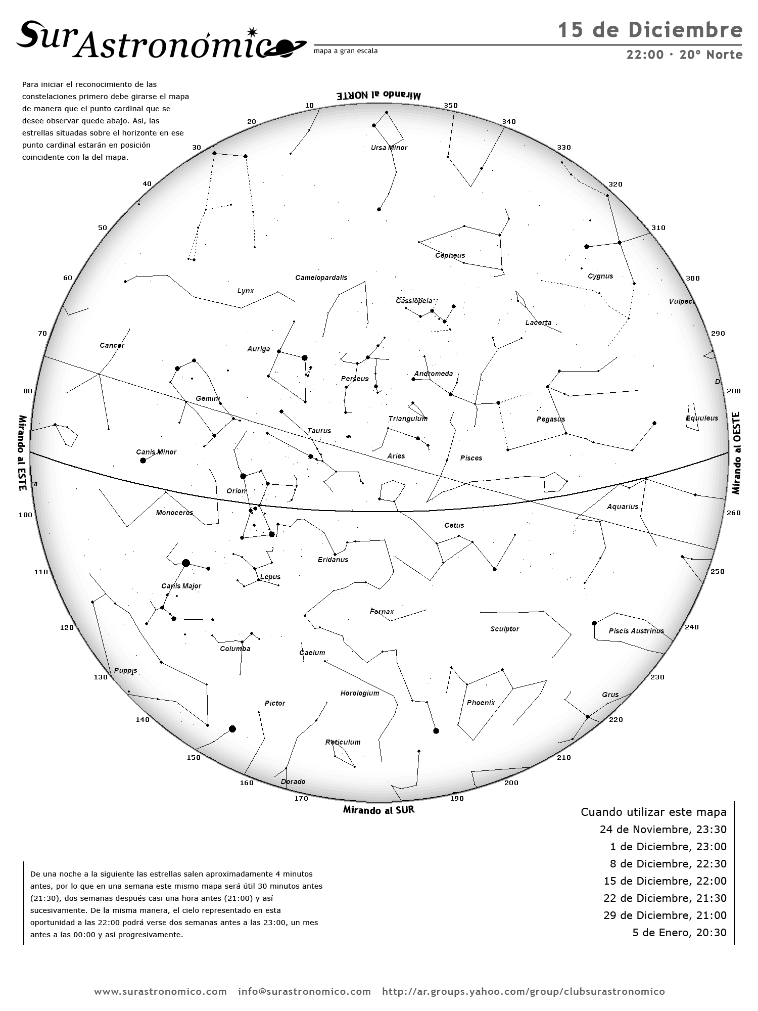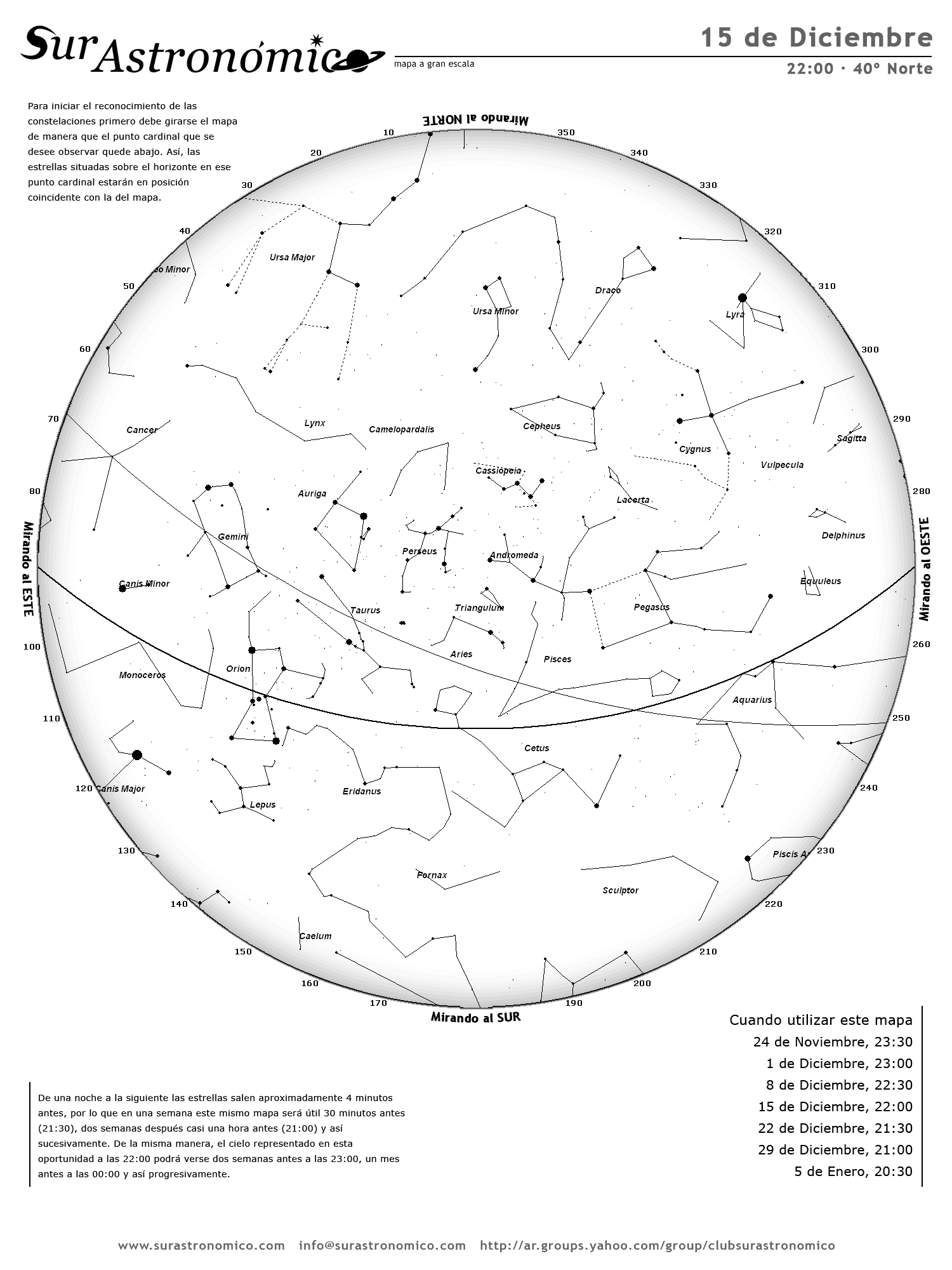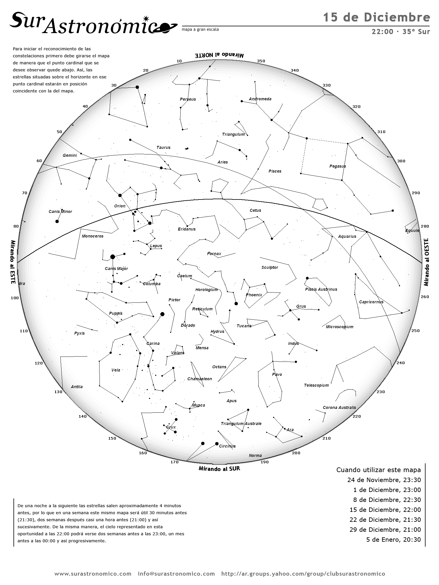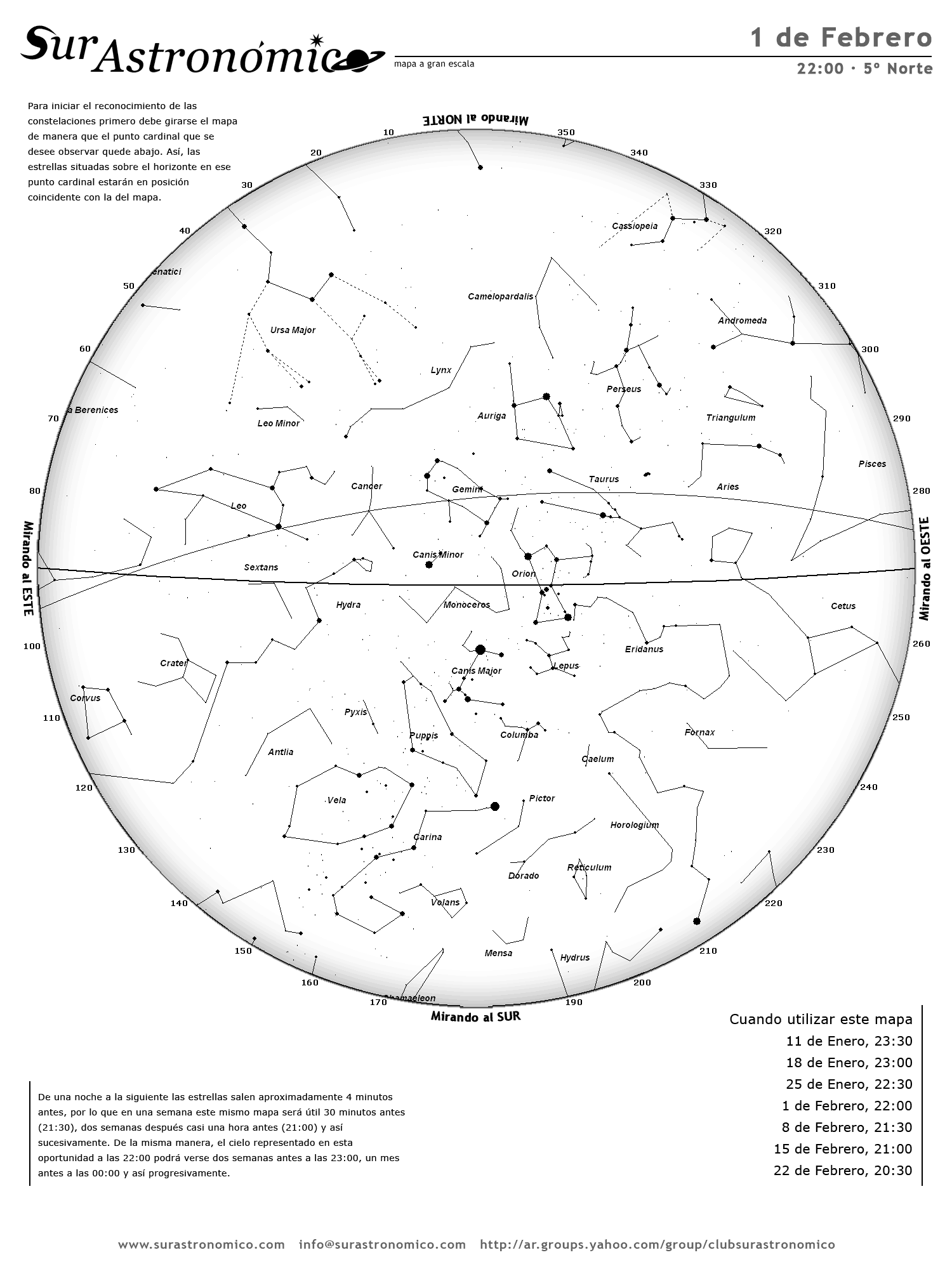 - De una noche a la siguiente las estrellas salen aproximadamente 4 minutos antes, por lo que en una semana este mismo mapa será útil 30 minutos antes (21:30), dos semanas después casi una hora antes (21:00) y así sucesivamente. De la misma manera, el cielo representado en esta oportunidad a las 22:00 podrá verse dos semanas antes a las 23:00, un mes antes a las 00:00 y así progresivamente.